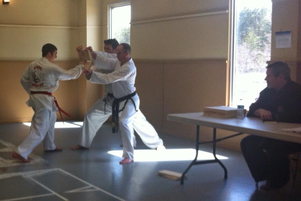April 13, 2014 - I will not go into details of how my day unfolded on the early morning of Tyler's Belt Test...But I do know that he was going to let Sir know that he was not going to test as he felt that he was not ready. That's the last I heard of him till when he got home after his work shift....at 10 pm...my son woke me up to tell me he was going to have to start training for a 10k run.... Half asleep, I was like ....what?.....my boy ended up testing for his double black stripe in the morning.... Thank you Sue Henry for sending me a pic of his 2 board palm break this morning....You have no idea how proud I am of this boy errrr young man
